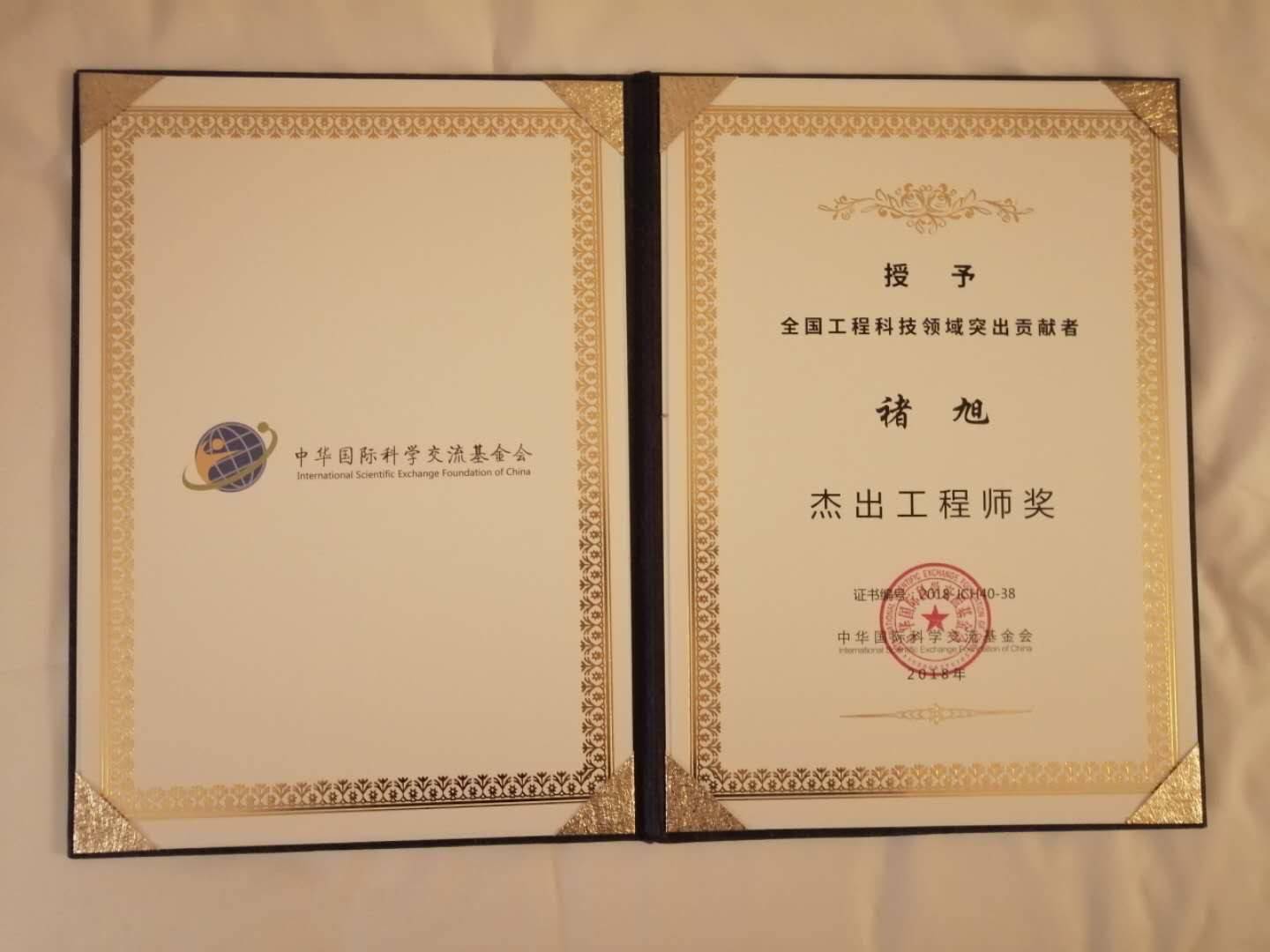 褚旭研究员“杰出工程师”荣誉证书