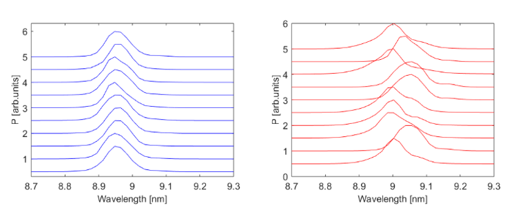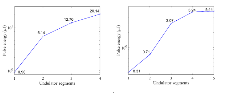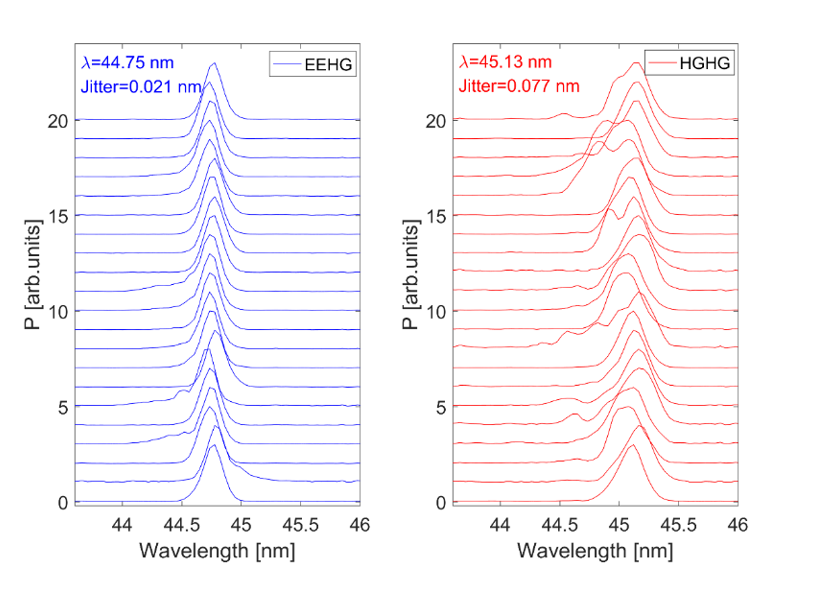 第二级中心波长稳定性对比:EEHG-HGHG级联模式(左)与HGHG-HGHG级联模式(右)