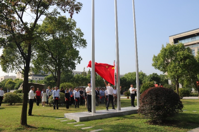 上午9时整,护旗队迈着统一步伐护旗行至升旗台。伴随着雄壮的国歌声,鲜艳的五星红旗冉冉升起、迎风飘扬,在场的每一位职工、学生庄严肃立,向国旗行注目礼,齐唱国歌,深怀对祖国无限的热爱和崇高的敬意,共同祝福伟大祖国蒸蒸日上、繁荣昌盛。