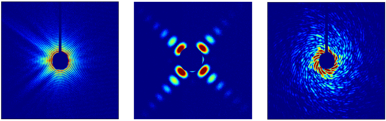 图1. 标准样品圆孔、方孔及鹦鹉螺图案的相干衍射图样