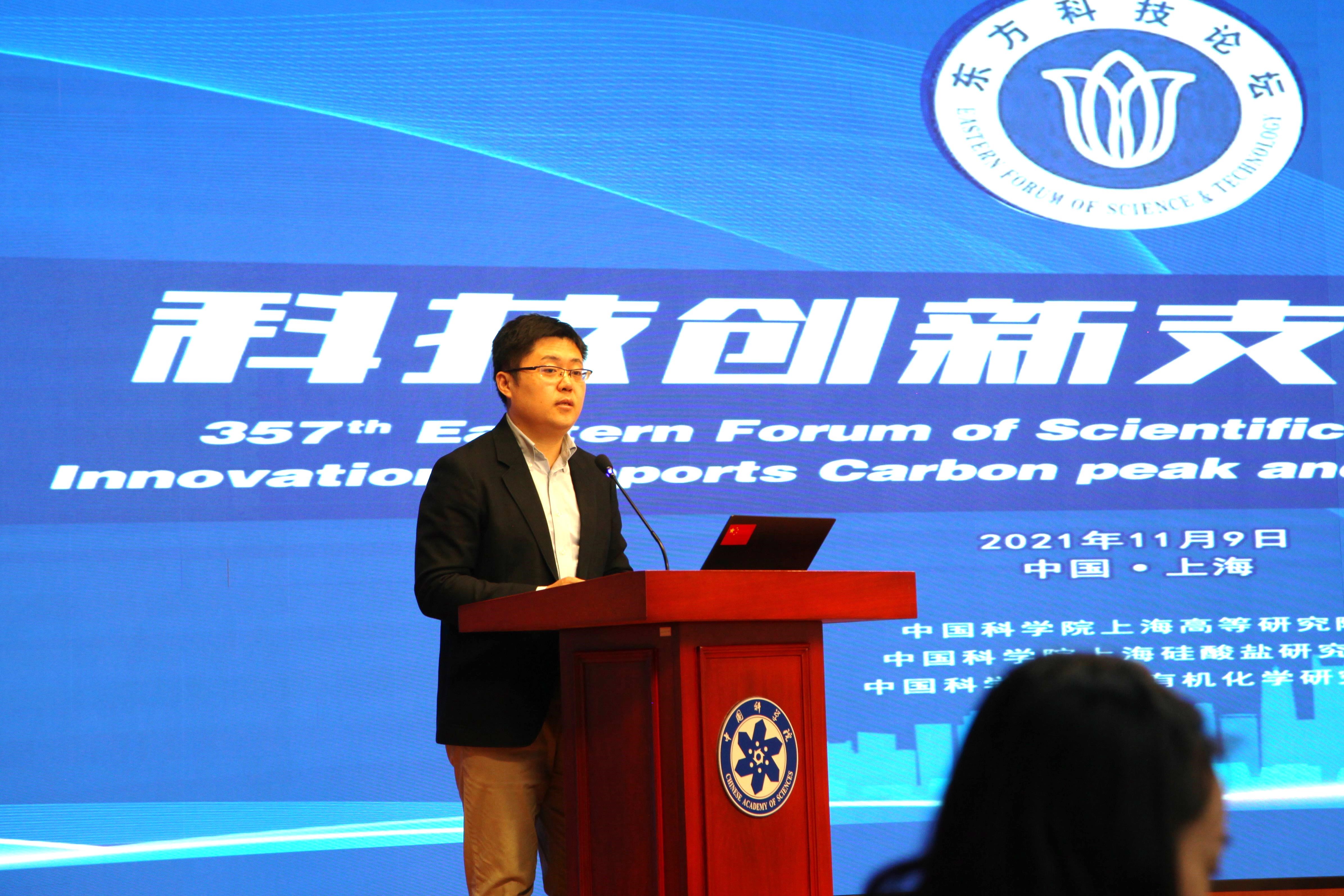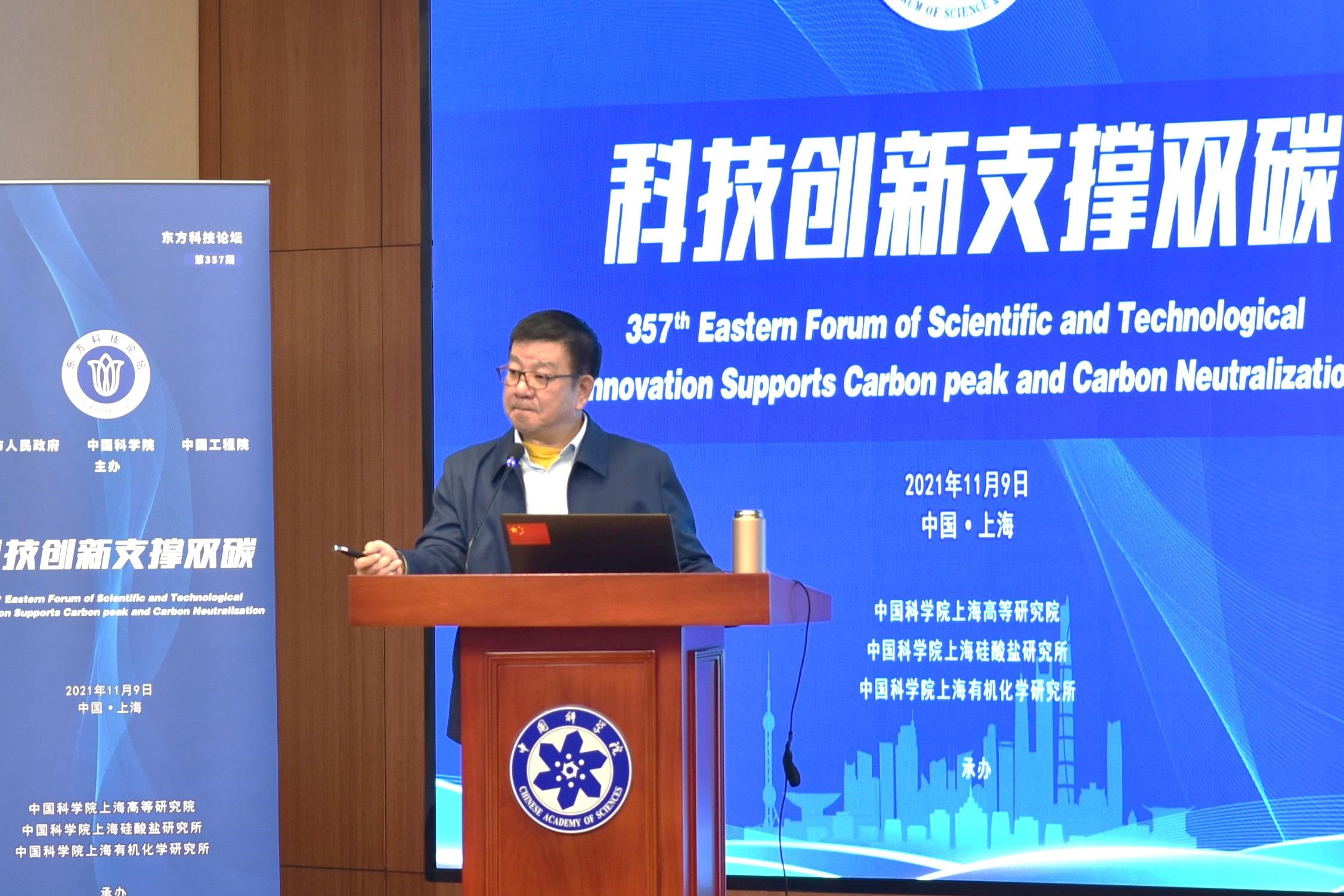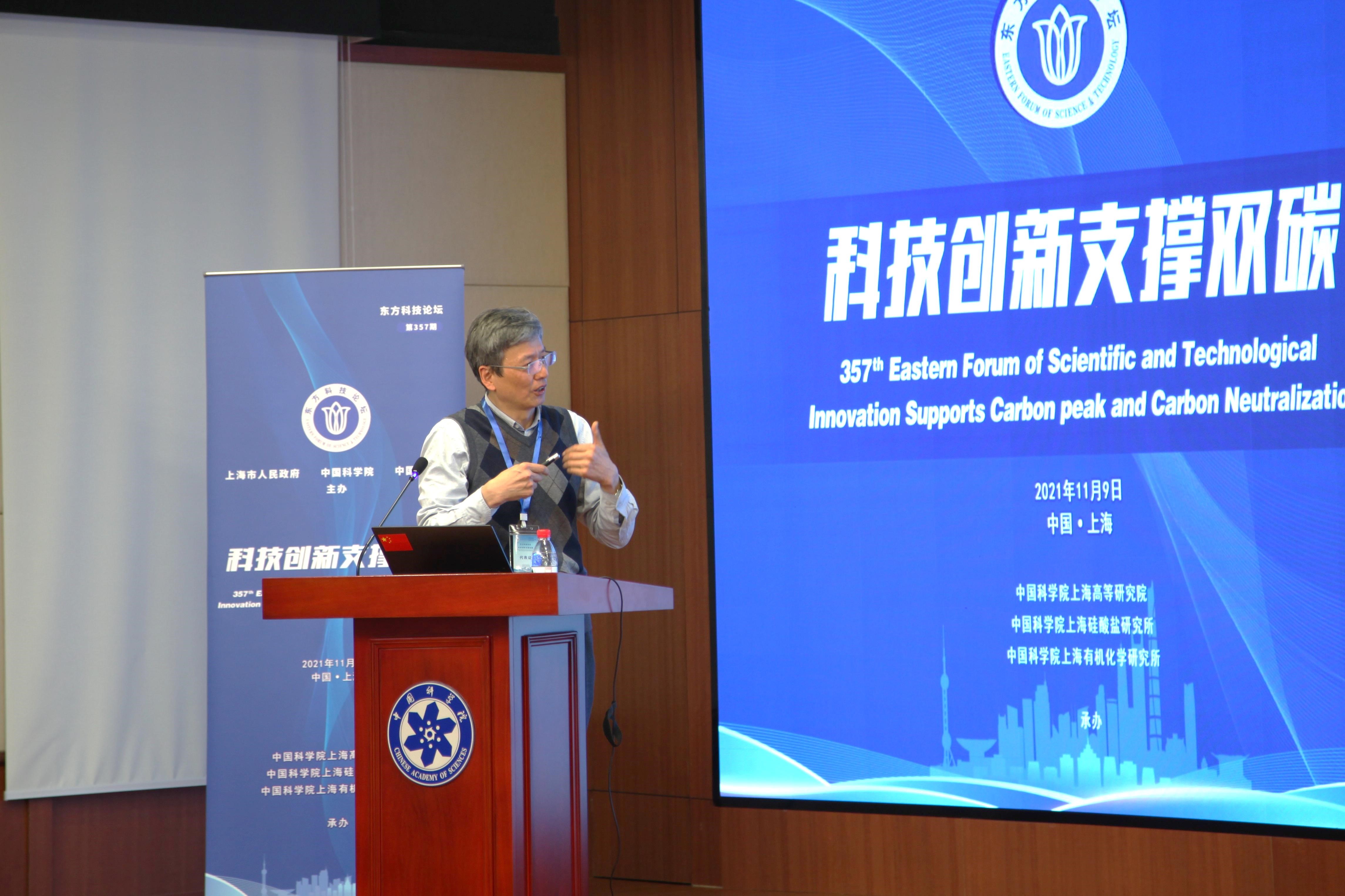 2021年11月9日,第357期东方科技论坛“科技创新支撑双碳”研讨会在中国科学院上海分院举办。本次论坛由上海市人民政府、中国科学院和中国工程院主办,中科院上海高等研究院、中科院上海硅酸盐研究所、中科院上海有机化学研究所联合承办。中科院上海有机化学研究所唐勇院士、中科院上海硅酸盐研究所施剑林院士、中科院上海高等研究院魏伟研究员共同担任会议执行主席。中国工程院院士黄震、中国科学院院士赵东元、中科院上海高等研究院副院长邰仁忠、中科院上海硅酸盐研究所副所长吴成铁以及来自科研院所、高校的90余位嘉宾和研讨专家参加了论坛。