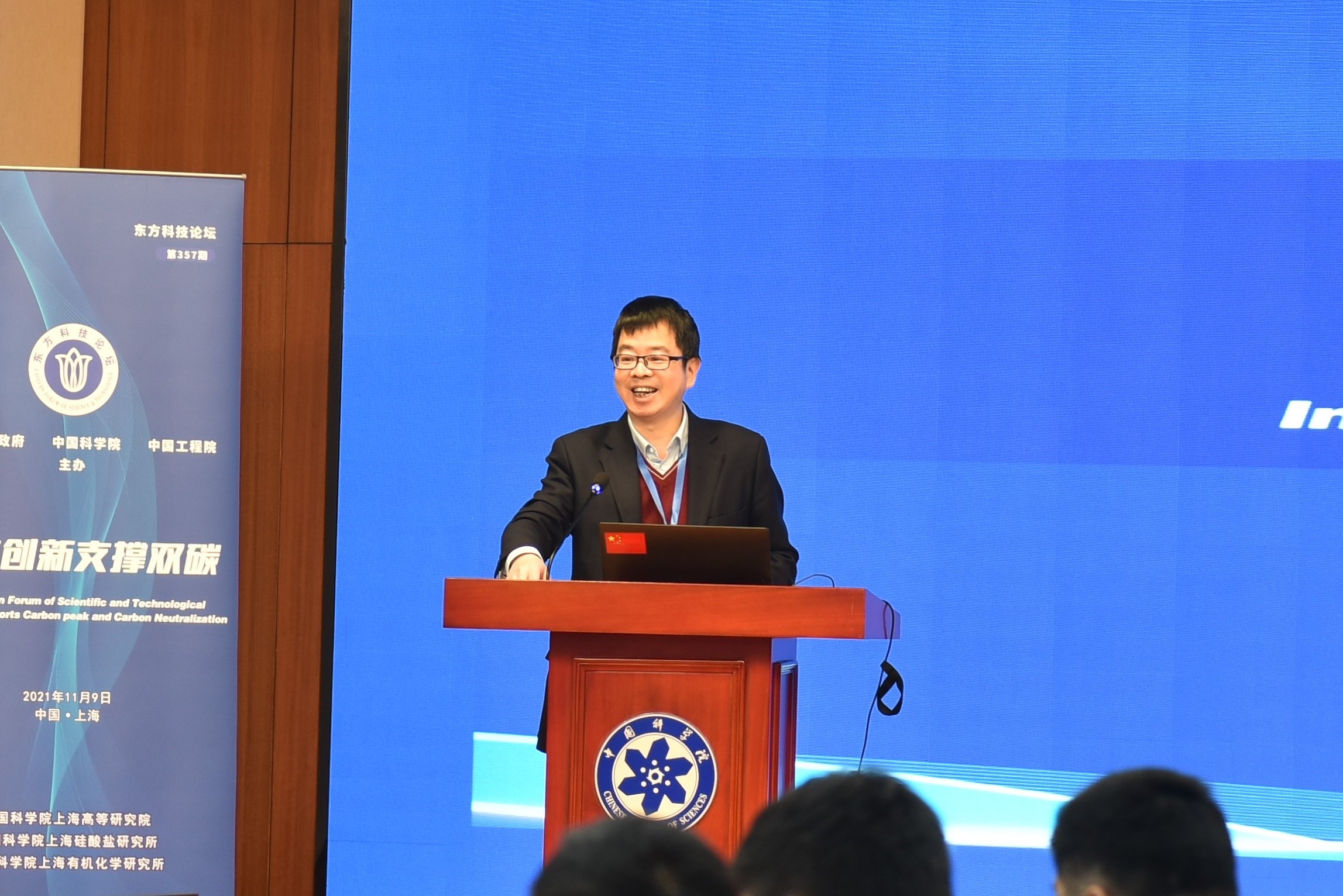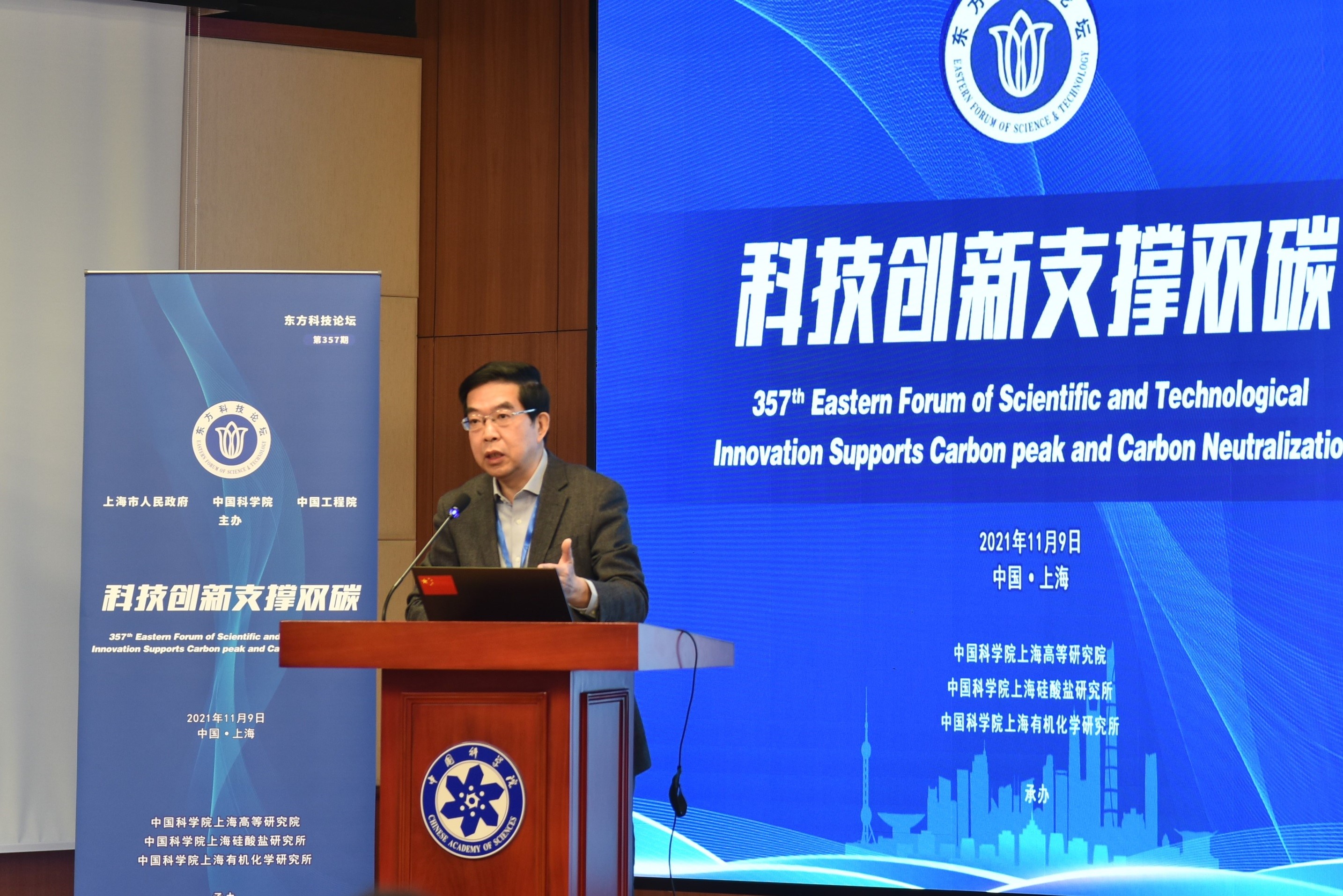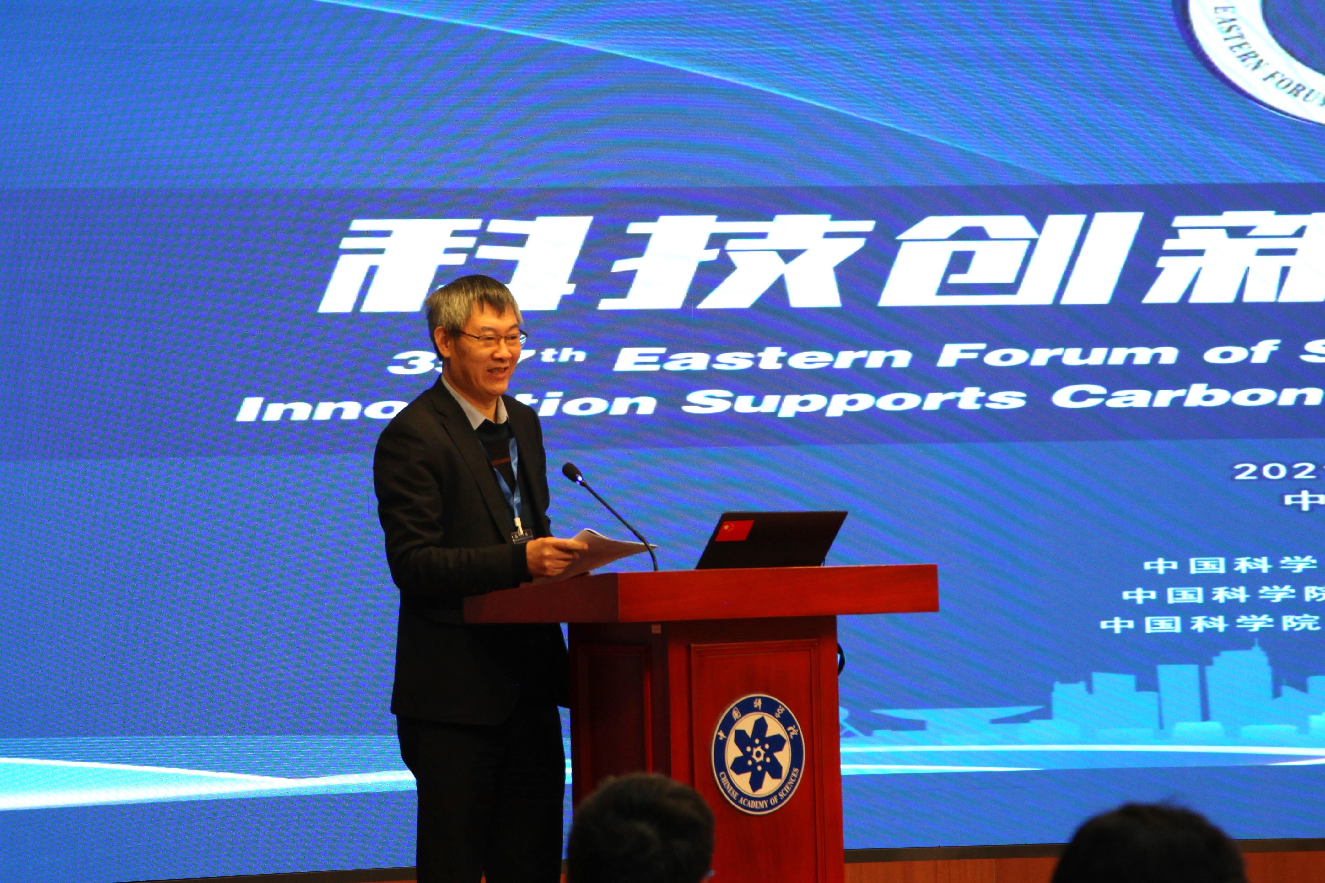 2021年11月9日,第357期东方科技论坛“科技创新支撑双碳”研讨会在中国科学院上海分院举办。本次论坛由上海市人民政府、中国科学院和中国工程院主办,中科院上海高等研究院、中科院上海硅酸盐研究所、中科院上海有机化学研究所联合承办。中科院上海有机化学研究所唐勇院士、中科院上海硅酸盐研究所施剑林院士、中科院上海高等研究院魏伟研究员共同担任会议执行主席。中国工程院院士黄震、中国科学院院士赵东元、中科院上海高等研究院副院长邰仁忠、中科院上海硅酸盐研究所副所长吴成铁以及来自科研院所、高校的90余位嘉宾和研讨专家参加了论坛。