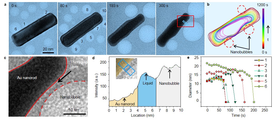 孙立涛教授团队利用电子束辐解水产生氧气气泡,首次构建并实时观察了溴化氢水溶液中氧气气泡刻蚀金纳米棒的固-液-气三相反应(如图1所示)。实验观测观察发现,当金纳米棒周围没有纳米气泡时,该纳米棒逐渐被氧化刻蚀演变成表面光滑的椭球形并最终消失;但当金纳米棒周围存在纳米气泡时,靠近纳米气泡的位置的纳米棒会被加速刻蚀,并演变成局部凹陷的结构。值得指出的是,当发生局部凹陷时,纳米棒和纳米气泡并非是直接接触的,二者之间存在超薄液膜(如图2所示)。大量实验结果定量分析可知,仅当纳米气泡与固体之间的距离小于临界尺寸(~1 nm)时,刻蚀速率才显著提升(一个量级以上);否则,刻蚀速率几乎不变。