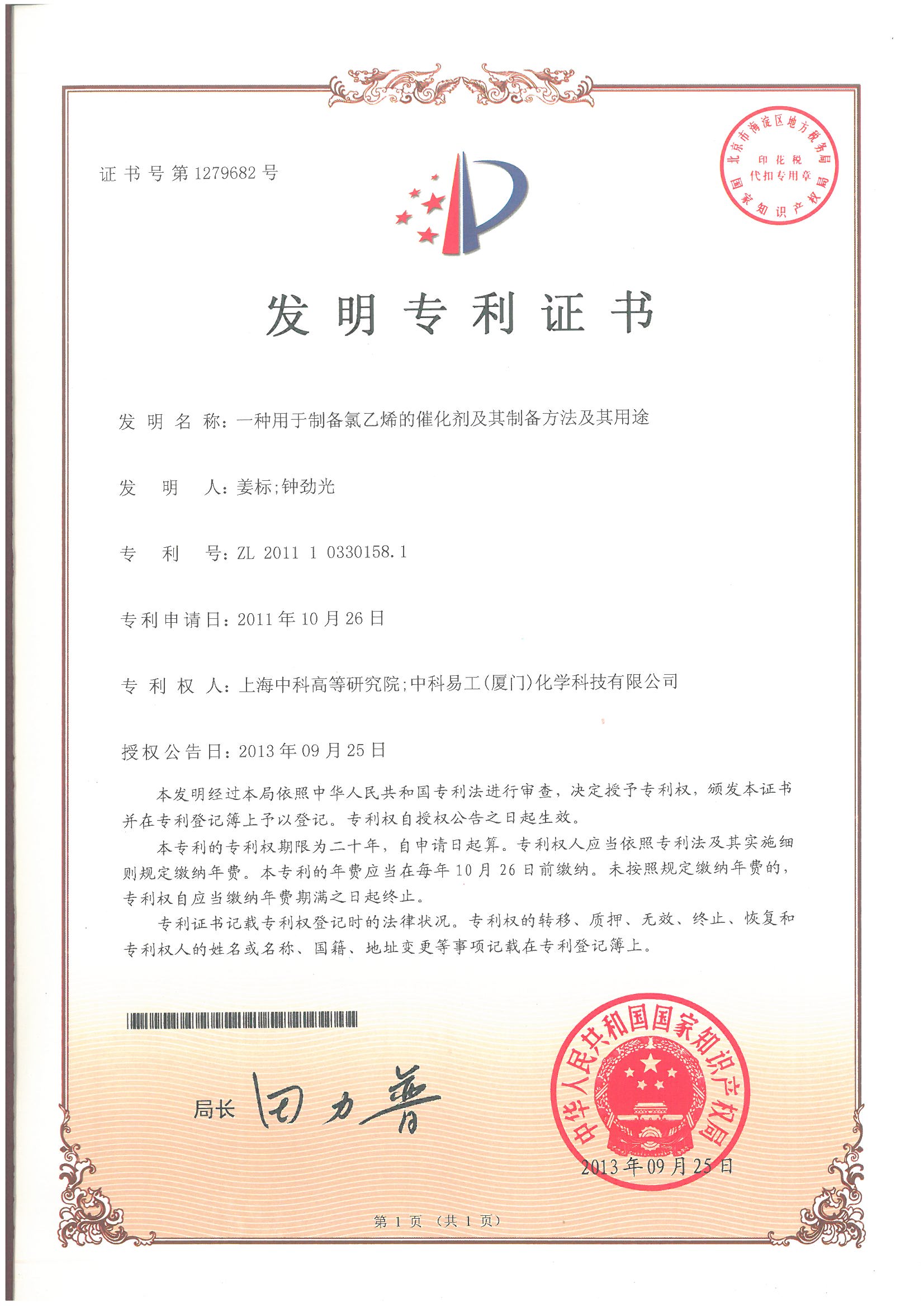 7月26日,国家知识产权局公布了第23届中国专利奖授奖的决定,对在实施创新和推动经济社会发展等方面作出显著贡献的专利权人、发明人(设计人)以及相关组织者给予表彰,赢乐lV榜上有名。高研院和中科易工(上海)化学科技有限公司共同拥有的授权发明专利《一种用于制备氯乙烯的催化剂及其制备方法》(专利号ZL201110330158.1,高研院发明人为姜标)喜获第23届中国专利优秀奖,这是高研院首次获得中国专利奖。
