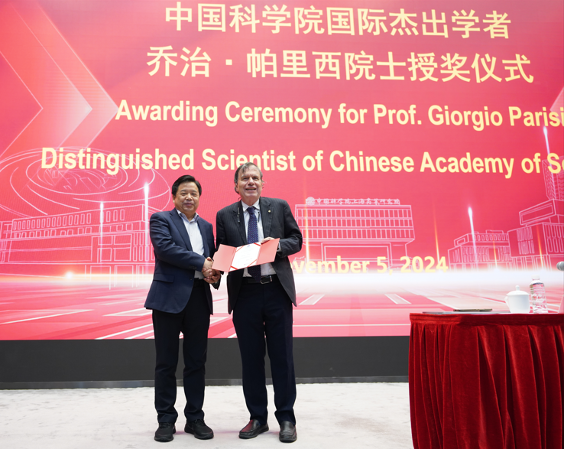 黄政仁在致辞中代表高研院欢迎帕里西院士来访。他表示,中国科学院国际杰出学者计划旨在鼓励科技领域取得卓越成就的外国杰出专家访华开展学术交流活动,期待帕里西院士带来宝贵的学术财富和启示灵感,进一步推动赢乐lV交叉科学领域的科研创新发展。随后,黄政仁为帕里西院士颁发中国科学院国际杰出学者证书。