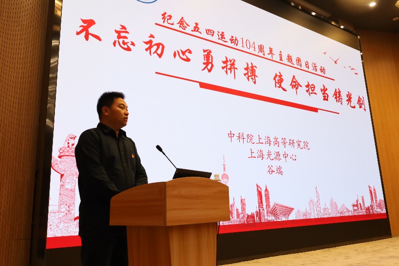 高研院团委副书记谷端,代表荣获“中国青年五四奖章集体”与“上海市青年五四奖章集体”的高研院软X射线自由电子激光攻关青年团队,作题为《不忘初心勇拼搏,使命担当铸“光剑”》的分享报告,激励广大青年在时代的潮流中挺膺担当,以朝气蓬勃、锐意进取的精神面貌积极为全面建设社会主义现代化国家贡献青春力量。